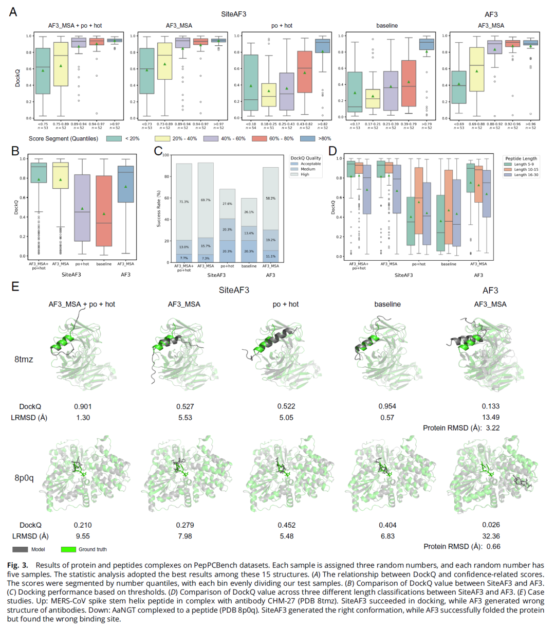 为此,研究人员开发了 SiteAF3,通过在 AlphaFold3 框架中引入 条件扩散(conditional diffusion)机制 与 口袋/热点信息引导,实现受体固定条件下的高精度位点特异性折叠。这一方法显著提升了复合物结构预测的准确性与可控性。