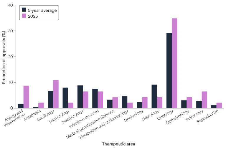 癌症仍是新药批准中最常见的治疗领域(图2)。CDER批准的新药中,有16种(35%)针对癌症,高于过去5年29%的平均水平。其他活跃领域包括心脏病(5项新批准,占11%)以及过敏和炎症性疾病(4项新批准,占9%)。