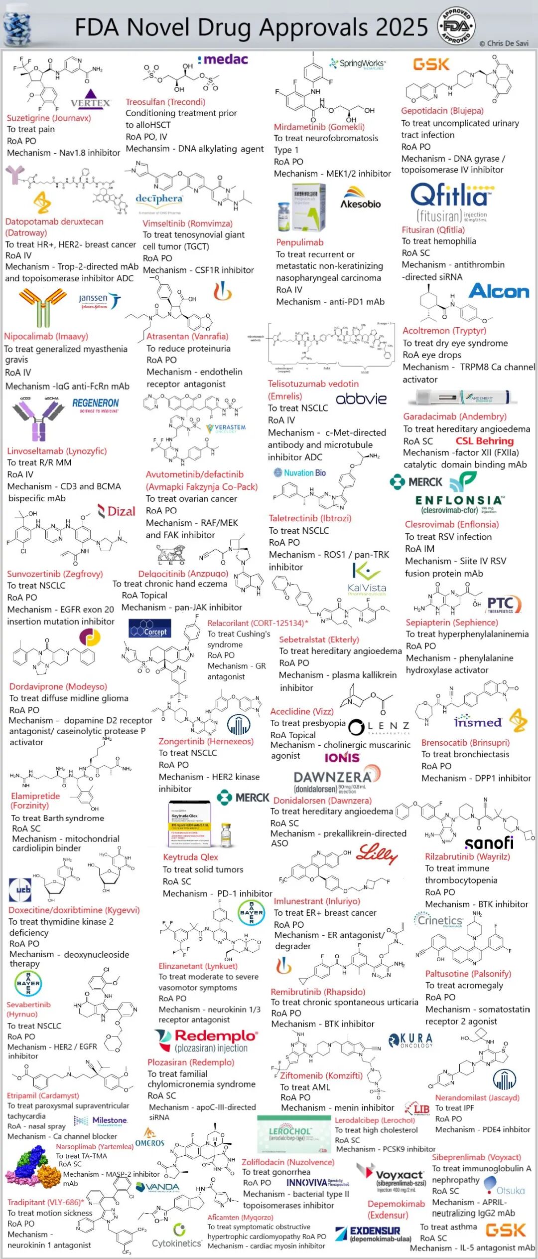 2025年也是激酶抑制剂有史以来成果最丰硕的一年,约占新批准小分子药物的三分之一。诺华的remibrutinib(Rhapsido) 成为FDA批准的第100个激酶抑制剂,彰显了此类药物在肿瘤领域之外的持续扩展。邓迪大学的Philip Cohen向《Nature Reviews Drug Discovery》表示:“这一领域尚未枯竭。”