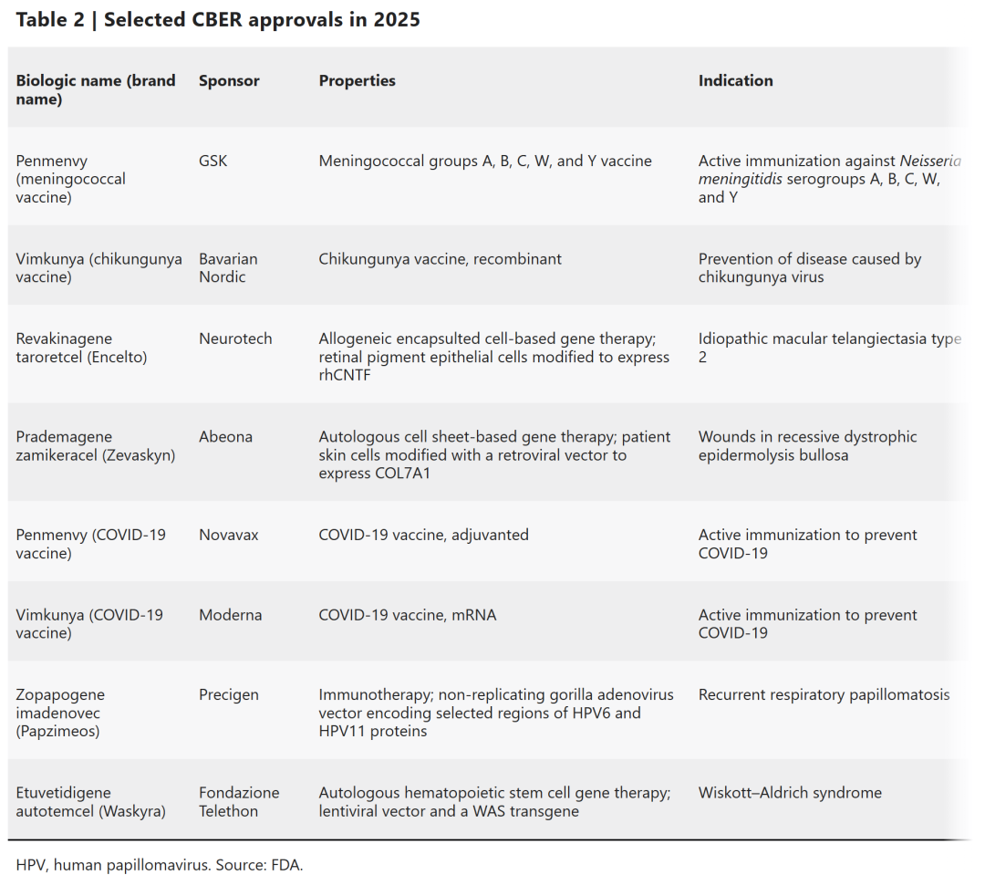 FDA尚未按监管分类公布这些新批准的细分数据。 生物制品评价与研究中心(CBER) 批准了8款值得关注的新产品(表2),包括首款由非营利组织开发的基因疗法。