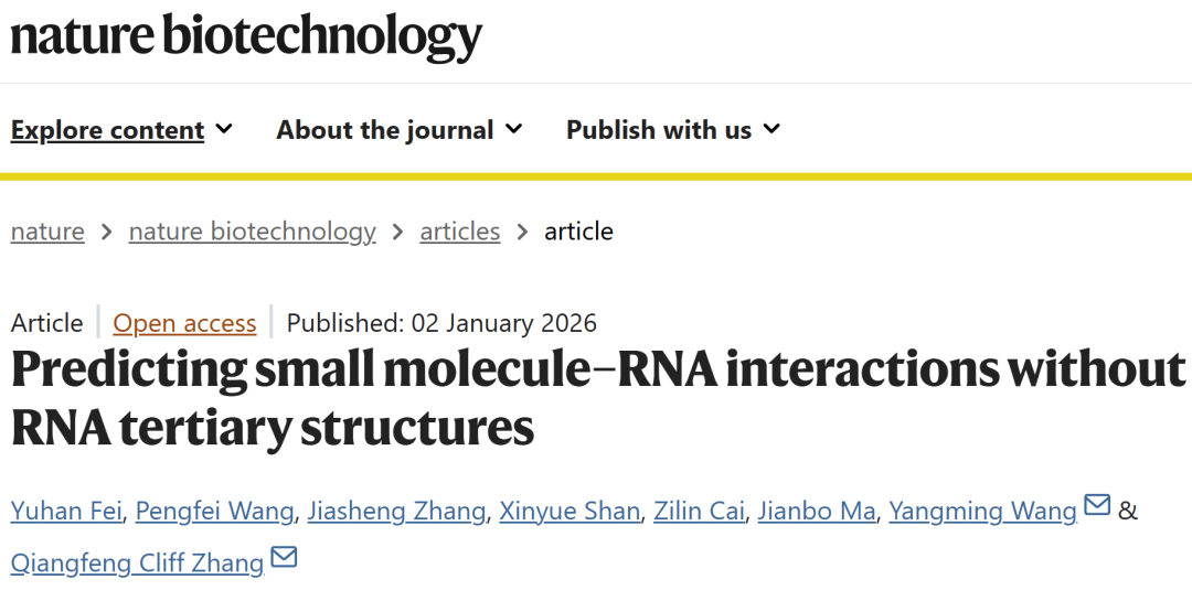 Fei, Y., Wang, P., Zhang, J. et al. Predicting small molecule–RNA interactions without RNA tertiary structures. Nat Biotechnol (2026).