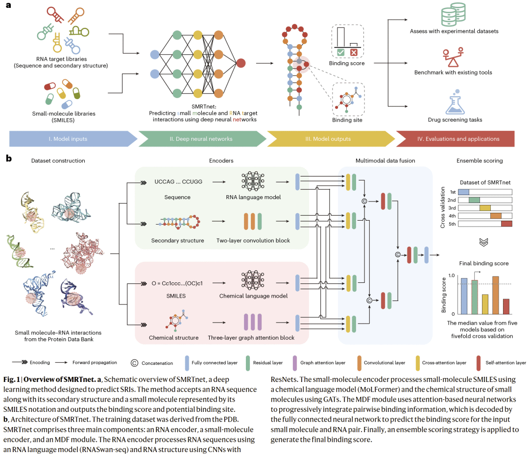 SMRTnet 以 RNA 序列与二级结构 以及 小分子 SMILES 表示 作为输入,通过多模态深度学习架构完成相互作用预测。模型主要包括四个模块: