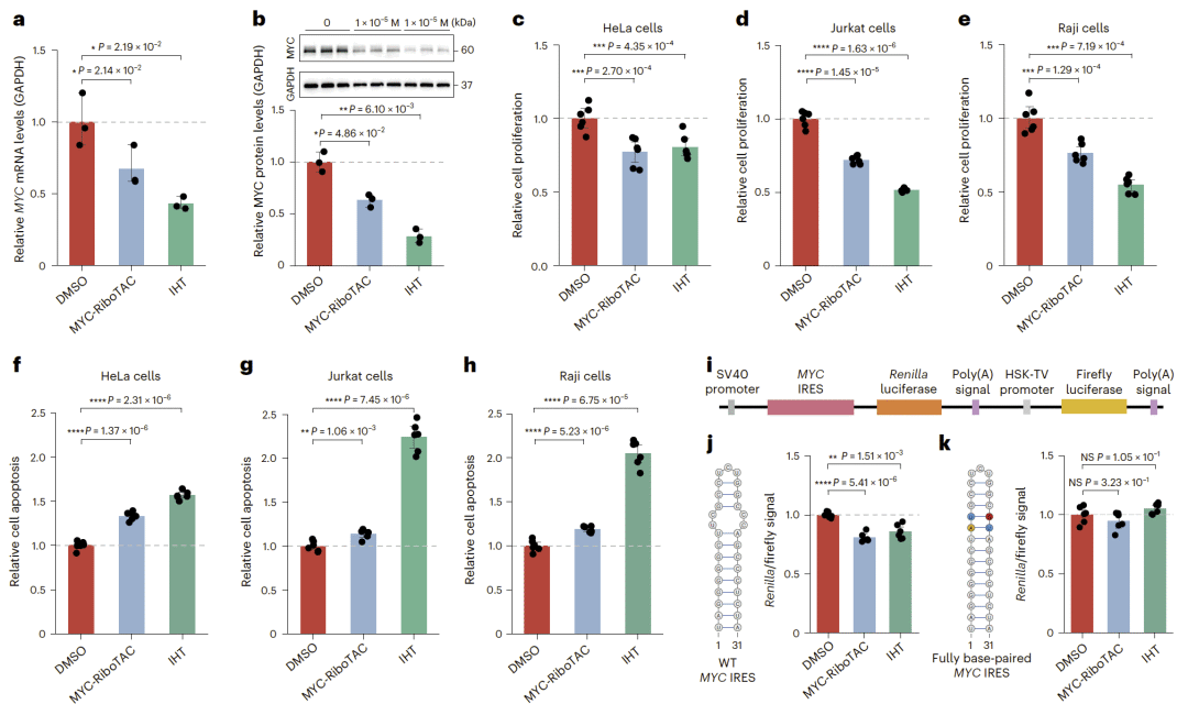 图 6|MYC IRES 靶向化合物 IHT 抑制 MYC 表达与细胞增殖。