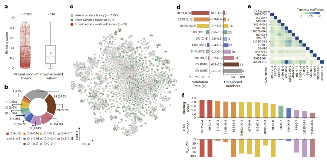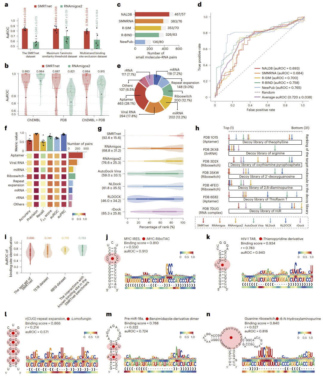 研究人员利用 SMRTnet 对十个疾病相关 RNA 靶点进行虚拟筛选,并通过实验验证确认 40 个真实结合分子。不同 RNA 靶点呈现出差异化的结合分子谱,显示模型对 RNA 结构差异具有良好分辨能力。