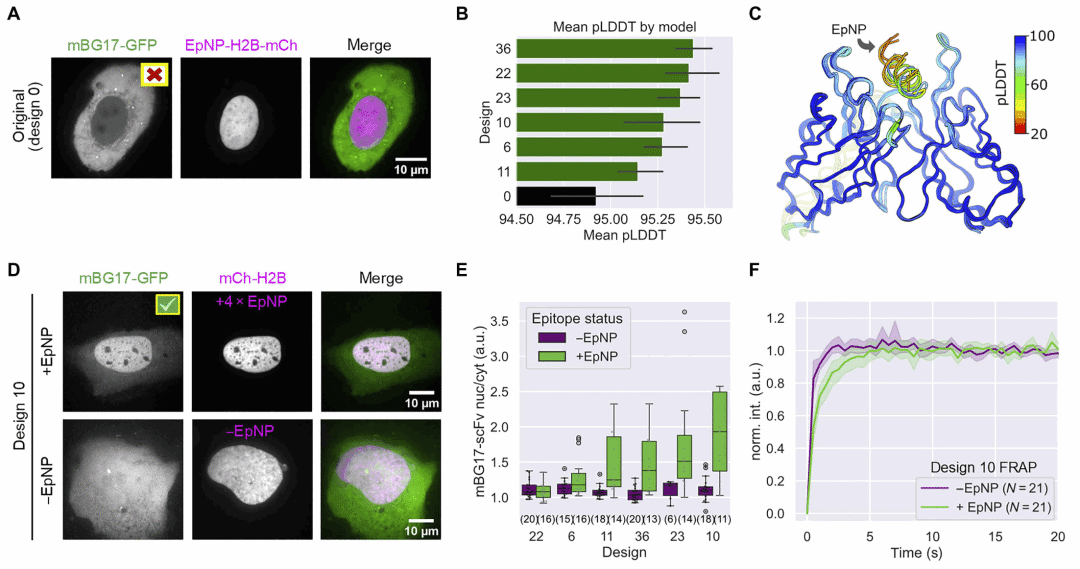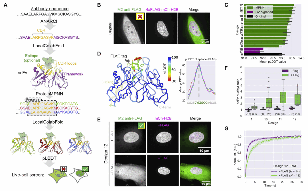 以常用的抗 FLAG 抗体为例,直接转换或传统框架嫁接方法均未获得功能性 intrabody。相比之下,经 AI 流程优化后的多个设计在活细胞中成功定位至靶标位置,并显示出特异结合行为,验证了该策略在改善胞内折叠与功能方面的有效性。