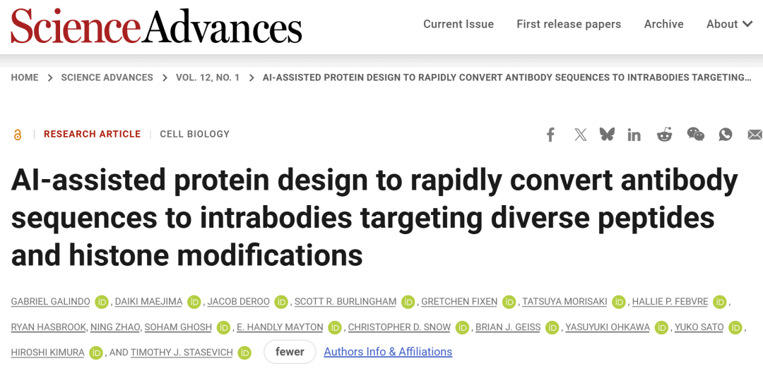 Gabriel Galindo et al. ,AI-assisted protein design to rapidly convert antibody sequences to intrabodies targeting diverse peptides and histone modifications.Sci. Adv.12,eadx8352(2026).