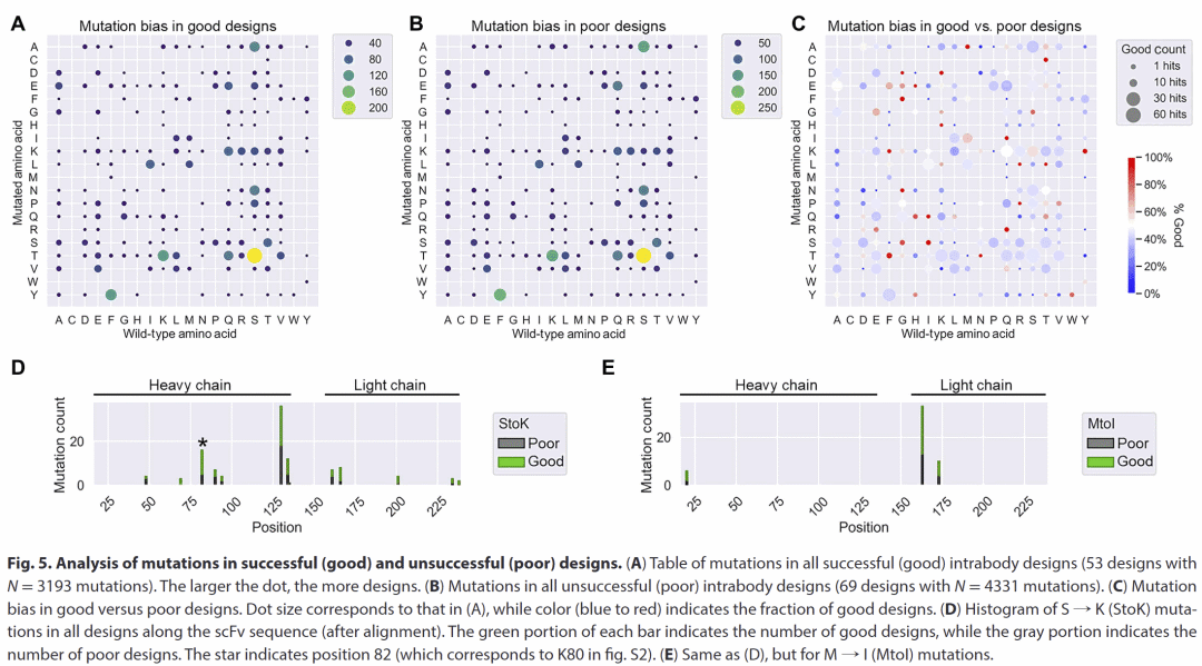 图5 | 成功与失败 intrabody 设计中突变分布与特征分析。