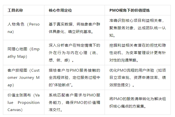 通过系统化地应用这些工具,PMO团队可以超越表面需求,真正理解客户的情感和动机,设计出既满足组织目标又解决客户实际问题的服务方案,最终实现客户价值与组织价值的双重提升。