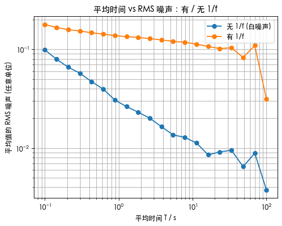 plt.title("平均时间 vs RMS 噪声:有 / 无 1/f")