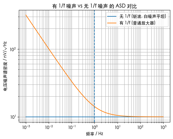 普通放大器:ASD 在 1 Hz 以下上升 → “有 1/f noise”。