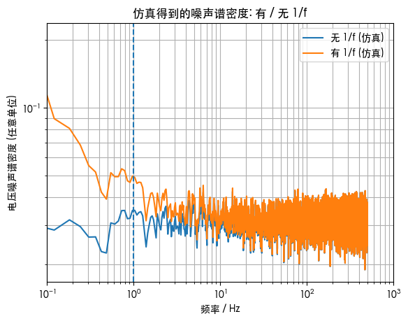 # 1. 频谱对比: 有 1/f vs 无 1/f