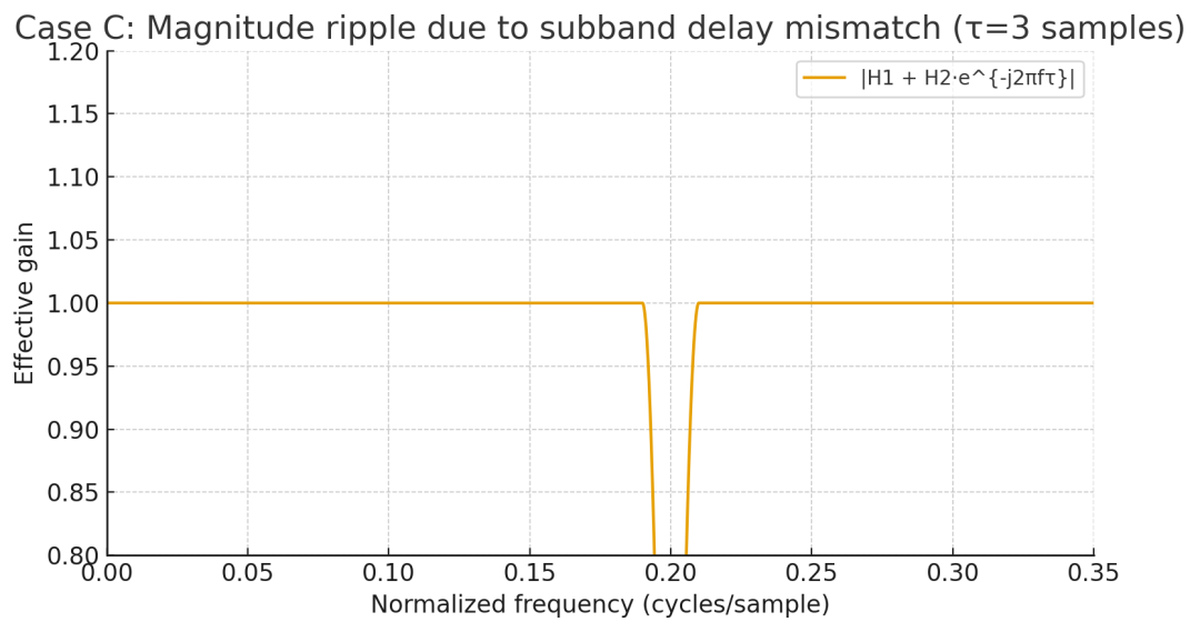 给子带2加了 τ=3 个采样的额外延迟;有效合成增益 在分界附近出现凹陷(图“Case C”);时域 RMS 误差升至 0.4905,局部波形出现振铃(最后一张图)。