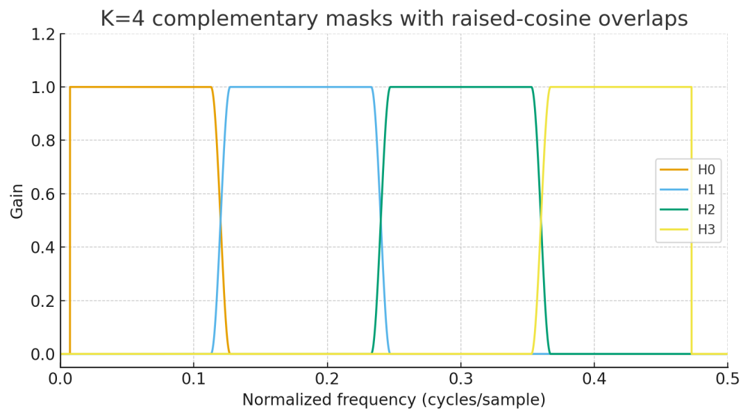把 4 子带的互补 raised-cosine 交叉淡入淡出实现为:每个边界两侧各一半过渡,交叠内 与 互补,整带求和恒等于 1;这就是 K 通道完美重构滤波器组(PRFB)的“Partition of Unity”。
