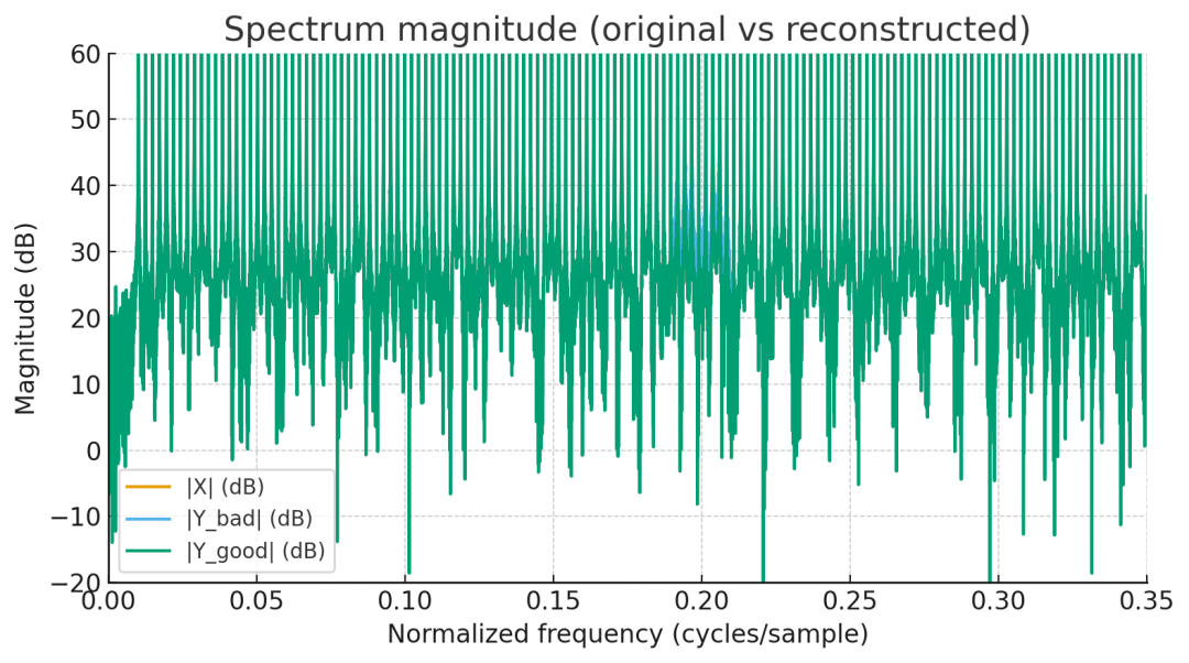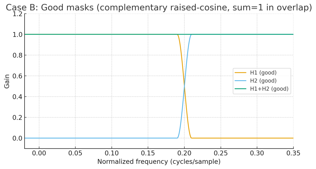图“Case B”里 H1+H2 ≡ 1;时域重构 RMS 误差 = 0(数值精度内);这就是完美重构滤波器组(PRFB)的核心条件:交叠区满足 。