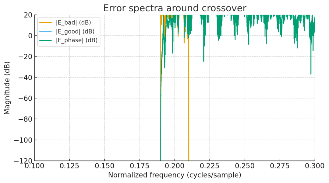 图“Case A”里 H1+H2 在交叠区等于 2,导致频域能量双计;时域重构 RMS 误差 ≈ 0.0999;误差谱主要集中在分界处(图“Error spectra around crossover”)。