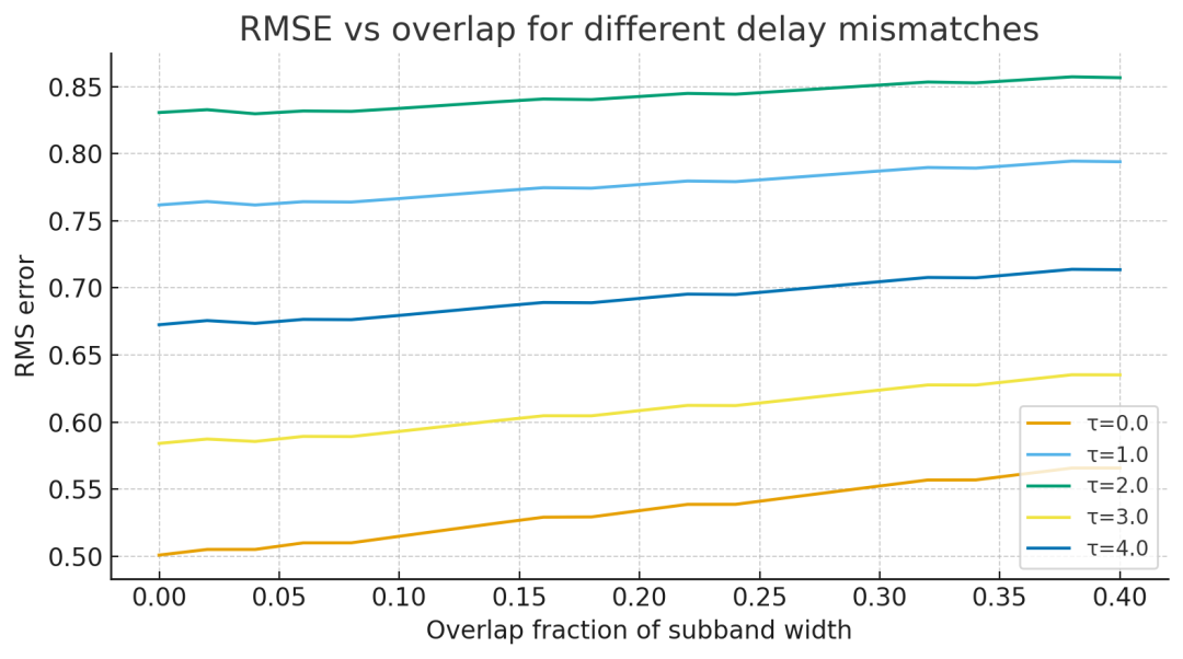 print(f"Min RMSE={RMSE[i_min,j_min]:.6e} at τ={tau_list_grid[i_min]:.3f} samples, overlap={ov_list[j_min]:.3f}")