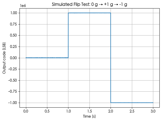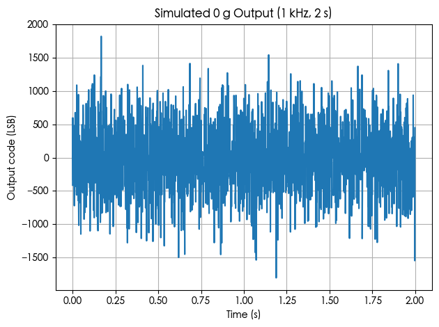 用这颗表头的典型规格(1 g = 1,000,000 LSB,1 kHz 输出、噪声主峰 ~±1000~1500 LSB、10 µg 级漂移)做了一个模拟输出。