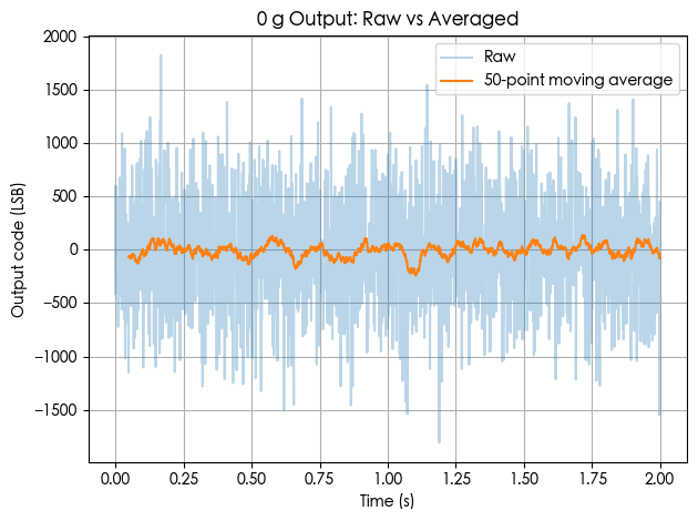 实际:叠加随机噪声(σ≈500 LSB)+ 10 µg 级慢漂