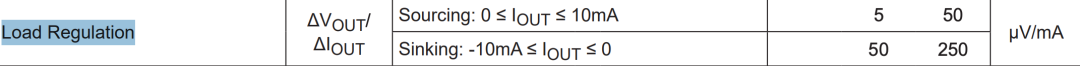 可源/可灌 10 mA。 并且区分了 sourcing/sinking 的负载调整率上限:源电流侧更强(最大 50 µV/mA),灌电流侧稍弱(最大 250 µV/mA)。
