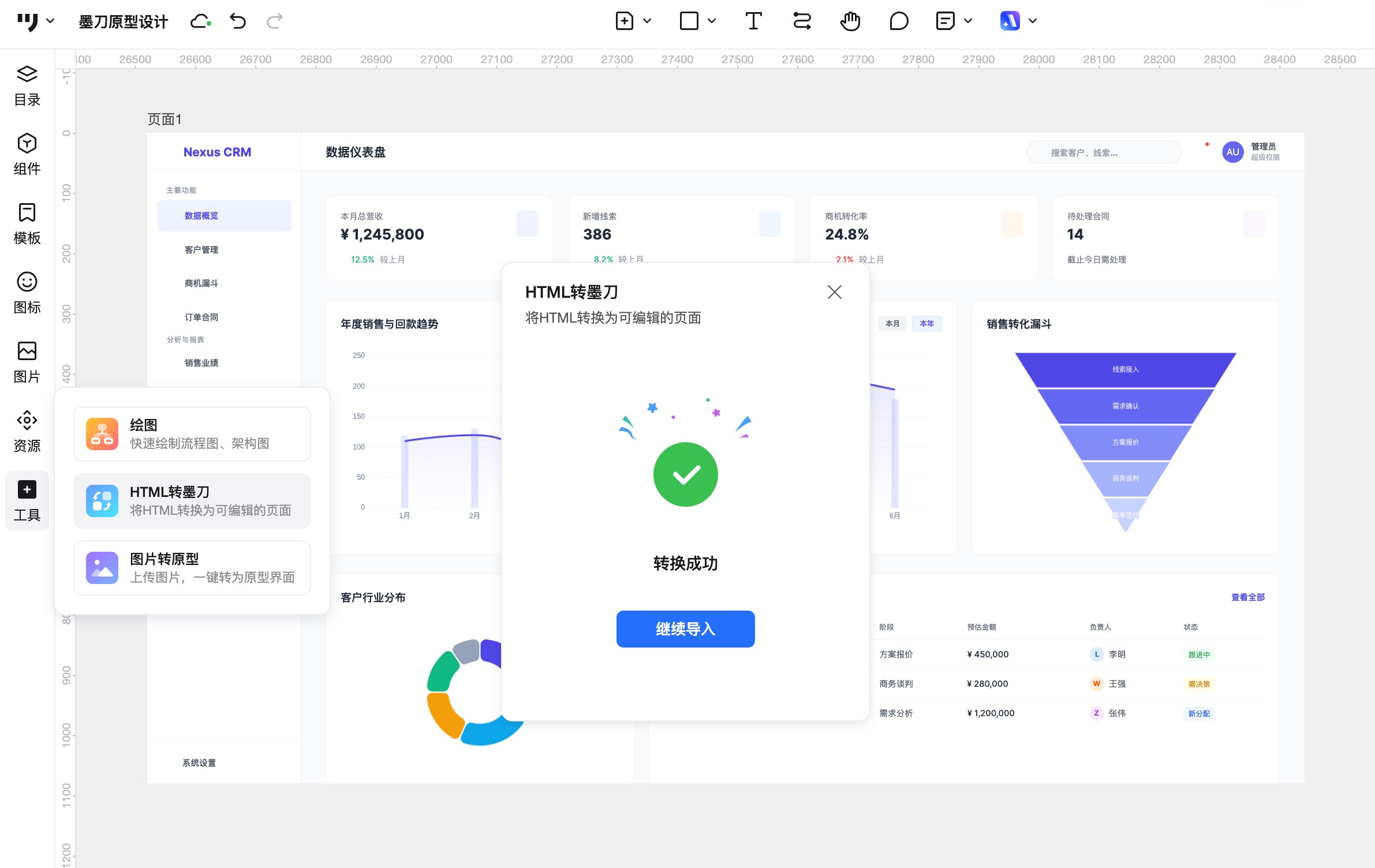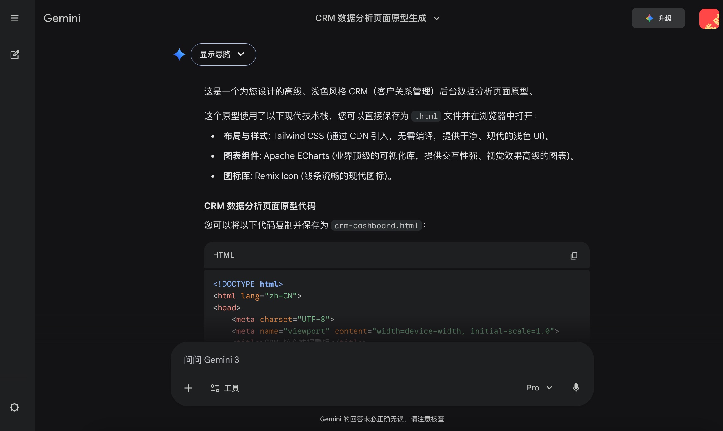 这次的案例是一个CRM管理后台,主要展示关键指标和数据报表。我操作的核心思路是:先让Gemini生成HTML原型,再导入原型工具调整和编辑。