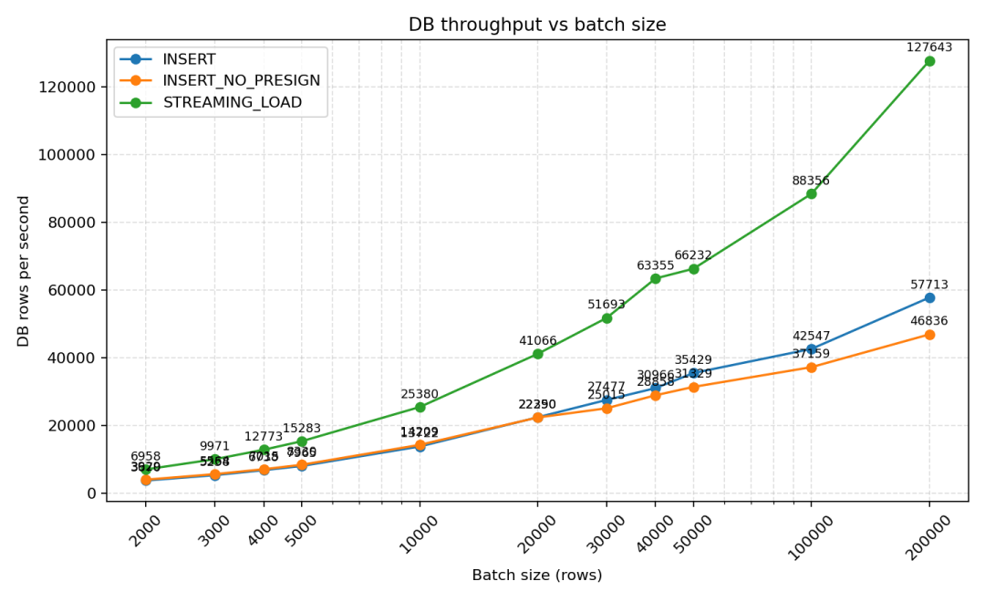 基于对象存储的批量加载,可以处理 CSV、NDJSON、Parquet、ORC 等文件及其压缩格式。这是性能最强的云原生写入方式。