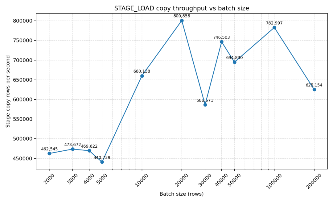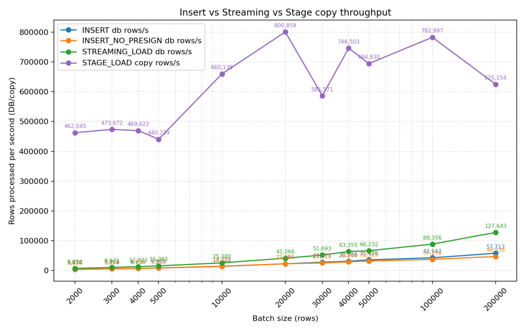 把四种方式放到一块对比,可以看出来 stage_load (copy into) 方式是遥遥领先于其它方式。实际生产环境 3 个节点的集群、数据源足够的情况下,COPY INTO 可以达到 230万+行/秒 的速度摄入。