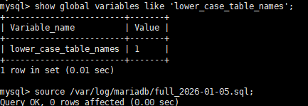mysql> source /var/log/mariadb/full_2026-01-05.sql;
