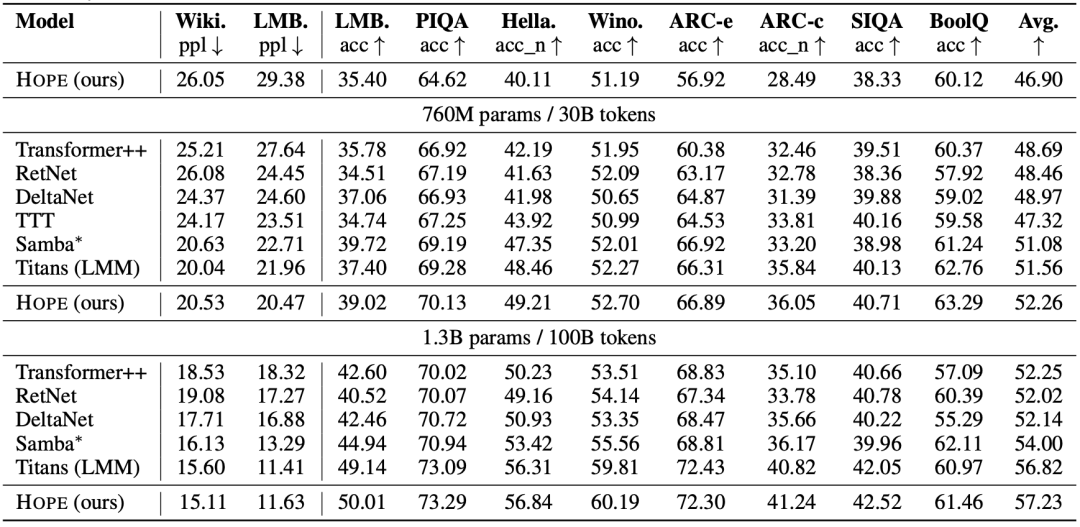 在多项标准测试中(如语言建模、常识推理),HOPE 都展现出了卓越的性能: