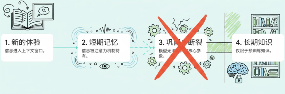 我们可以把现在的主流大模型想象成一位已经毕业离校的博士。他在学校里(预训练阶段)博览群书,学富五车。但当他步入社会工作(部署上线),就几乎停止了系统性的学习,只能依靠在校时积累的知识来应对问题。对于社会上的新趋势、新知识,他要么完全不知,要么只能通过临时抱佛脚(上下文学习)来勉强应付,而且转眼就忘。