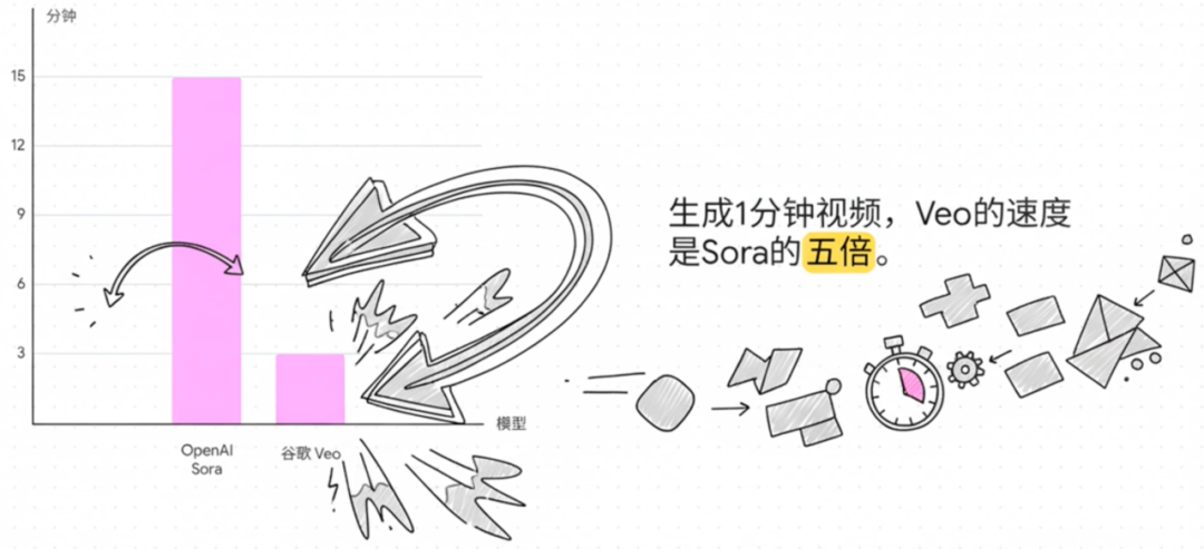 而真正形成代差优势的是 Gemini 的生成速度。创建1分钟视频的时间从Sora的15分钟压缩到3分钟,这不仅是量变,更是质变。它使得实时迭代创意成为可能:编导可以在一次会议的时间里,就看到五六种不同的视觉分镜方案。这背后是谷歌TPU算力体系的强力支撑,它让高质量视频生成的成本与门槛急剧降低,现在只需一杯咖啡的钱就可以创建视频概念预览。