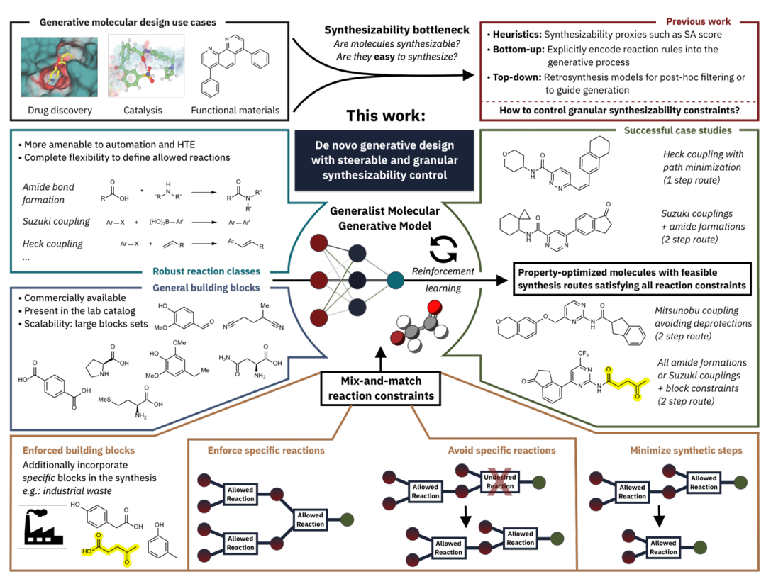 简介: 本文提出一种小分子生成设计框架,实现了对合成可行性的可控和细粒度控制。传统方法难以兼顾合成简易性和反应约束灵活性,而该框架通过结合预训练生成模型Saturn和 retrosynthesis模型Synthesus,利用强化学习(RL)将生成分子的多参数优化(如对接分数、药物相似性)与合成路径约束(如指定反应类型、避免副反应、最小化合成步骤)相结合。实验表明,生成分子不仅满足任意反应约束(如仅使用酰胺偶联反应或避免保护基反应),还能将工业副产物转化为目标分子,实现超大型虚拟库(如Chemspace的1420亿分子库)的高效筛选,仅需评估0.00001%的分子即可发现候选化合物。基准测试显示,该框架在样本效率和合成路径多样性上优于现有模型,尤其在单一反应类型约束下表现更优。代码开源,为自动化分子发现和绿色化学提供了新工具。