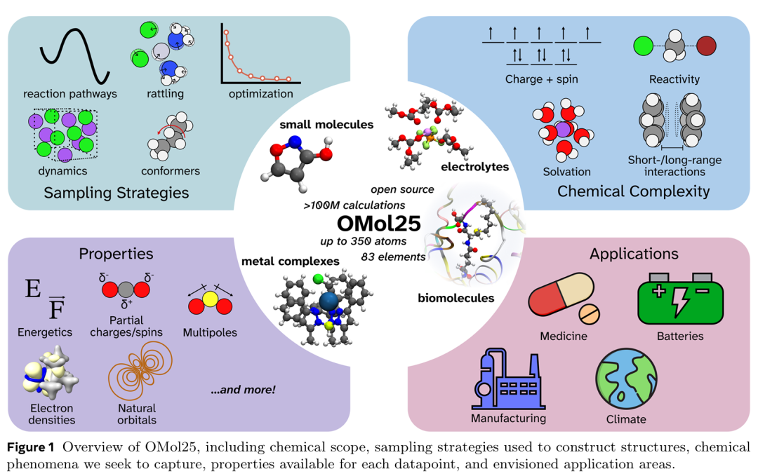 简介: 本文介绍了Open Molecules 2025(OMol25)数据集,包含超1亿个DFT计算数据,覆盖83种元素,涵盖生物分子、金属配合物、电解质等多类体系,具有高化学多样性和结构复杂性。数据集通过结合分子动力学采样、反应路径模拟和构象优化,确保涵盖电荷/自旋状态、溶剂化效应和反应活性等特性。配套的基准模型(如eSEN、GemNet-OC)在多任务评估中表现出高预测精度,尤其在配体-蛋白相互作用、质子化能和构象优化任务中展现优势。OMol25还提供跨领域评估工具,支持机器学习模型在药物设计、电池电解液优化等场景的应用。该数据集开源且可扩展,为分子模拟和AI驱动的化学发现提供了重要资源。
