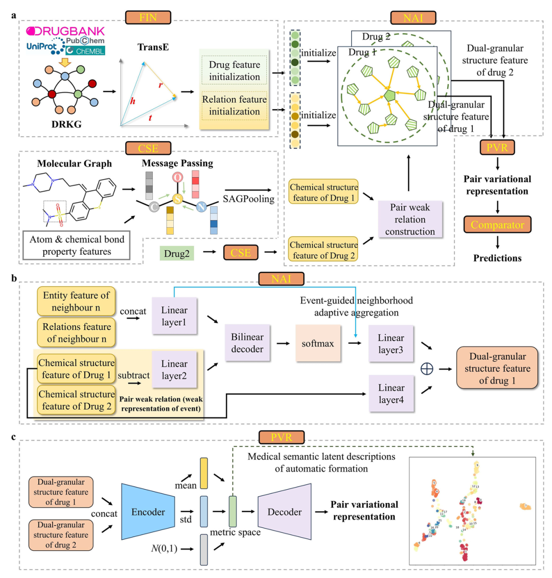 简介: 本文针对罕见药物-药物相互作用事件(DDIEs)预测难题,提出基于元学习的RareDDIE模型,通过双粒度结构驱动的药物对变分表示和生物语义迁移模块(BST),解决了传统方法在少样本和零样本场景下的局限性。模型通过化学子结构提取模块(CSE)和邻域自适应集成模块(NAI)捕获药物的分子结构和生物邻域信息,利用变分自动编码器(VAE)构建药物对的关系度量空间,并引入BST模块结合大规模句子嵌入模型BioSentVec实现零样本预测。实验使用DrugBank、TWOSIDES等数据集,在少样本(1-shot和5-shot)和零样本设置下,RareDDIE的AUC等指标显著优于META-DDIE、GMatching等七种基线方法,且能将DDIE元知识迁移至药物协同预测任务,在非小细胞肺癌药物协同案例中验证了实用性。该研究为数据有限场景下的药物相互作用预测提供了有效框架,推动了药物安全评估和组合疗法设计的发展。