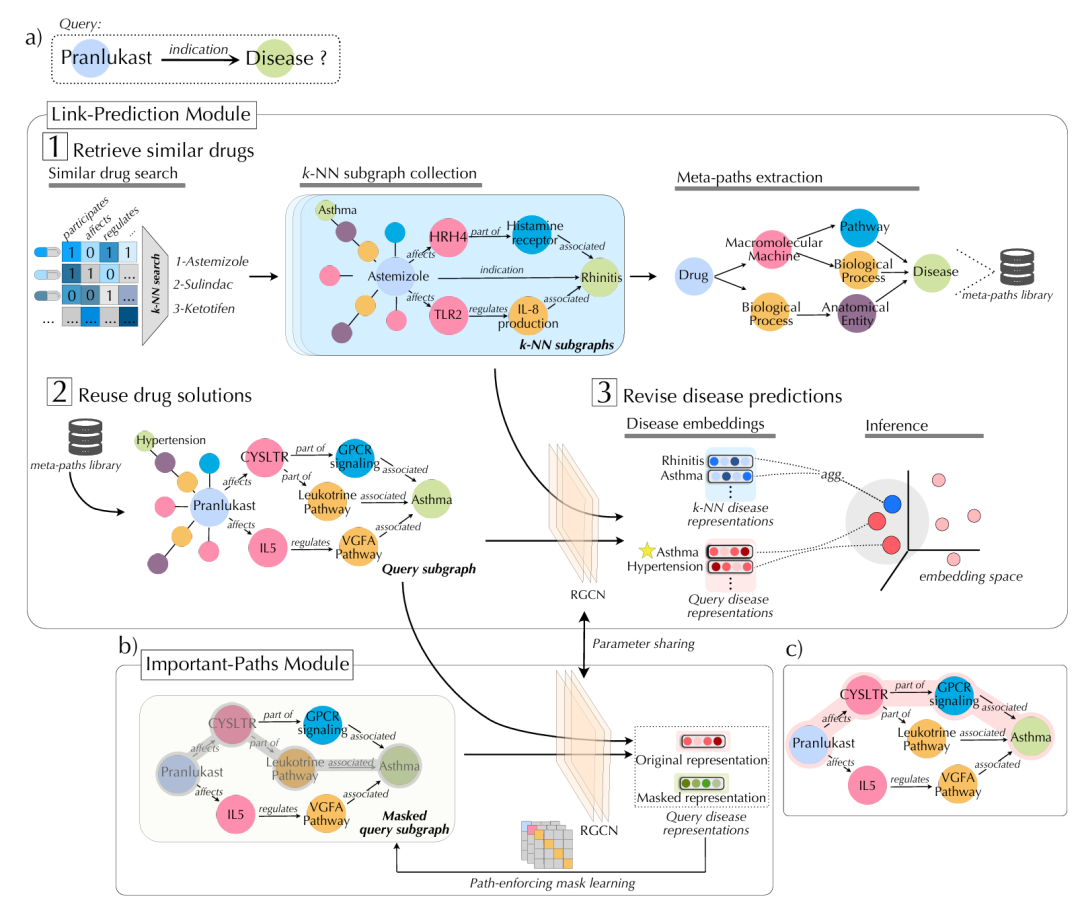 简介: 研究开发了基于案例的可解释图神经网络框架DBR-X,用于药物重新定位,通过链接预测模块(基于案例推理检索相似药物案例)和路径识别模块(异质路径掩码学习)生成可解释的药物-疾病关联预测。模型在Mechanistic Repositioning Network with Indications (MIND) 知识图谱上训练,包含250,035个节点和960万条边,测试集包含390个药物-疾病对。实验对比了R-GCN、CompGCN等基线模型,DBR-X在Hits@10和MRR指标上分别达0.5708和0.4789,显著优于传统方法。通过删除/插入研究和稳定性分析验证解释的忠实性,其ROCAUC达0.72,优于GNNExplainer等基线。案例研究显示,DBR-X为杜氏肌营养不良、 Timothy综合征等罕见病识别出潜在药物(如Bitolterol、Aranidipine),并提供多跳机制路径。该框架结合案例推理和图解释技术,提升了药物重定位的可解释性和生物学合理性。