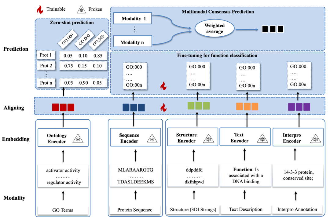 简介: 该研究提出多模态AI模型FunBind,通过整合蛋白质序列、结构、文本描述、结构域注释和GO术语,解决传统方法单模态或有限模态整合的局限性,实现零样本和监督学习下的蛋白质功能预测。模型通过对比学习的自监督预训练,将序列模态与其他模态在统一潜在空间对齐,支持无监督零样本预测,同时通过监督微调利用多模态进行功能分类。实验基于CAFA5数据集训练,使用Test Zero(含659个含新GO术语的蛋白质)、Test All(新发布蛋白质)和Test Novel(与训练数据序列相似度<30%的蛋白质)进行测试。结果显示,FunBind在零样本预测中,序列模态的R@5在CC、MF、BP类别分别达0.9129、0.9048、0.7845,多模态共识预测进一步提升性能;在监督分类中,优于TransFew、DeepGO-SE等现有方法,AUPR在BP类别达0.429。该研究为蛋白质功能预测提供了更准确且可泛化的多模态解决方案,展现了跨模态对齐和零样本学习的优势。