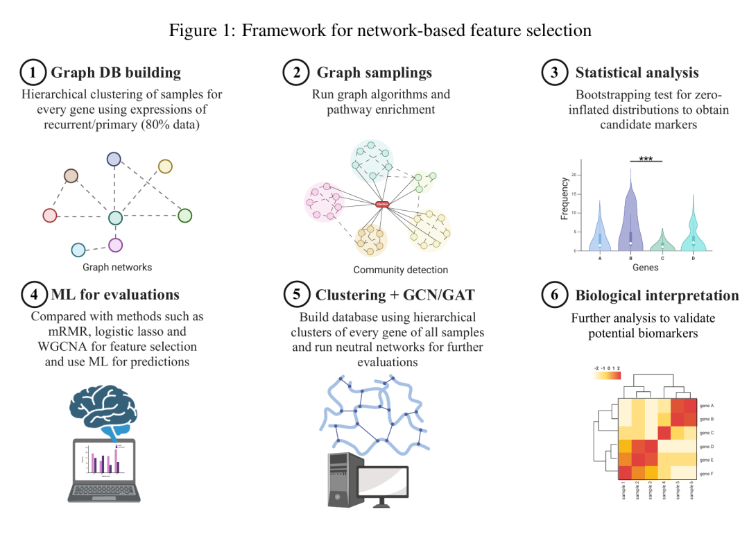 简介: 研究提出表达图网络框架EGNF,结合图神经网络(GCN/GAT)和基于网络的特征工程,解决传统方法在高维基因表达数据中捕获复杂分子关系的不足,用于生物标志物发现。该框架通过差异表达分析筛选基因,构建基于层次聚类的图网络,利用节点度、社区基因频率和通路富集进行特征选择,再通过GNN进行分类。实验验证基于三个独立数据集:GLASS胶质母细胞瘤数据集(295例原发/275例复发肿瘤)、TCGA乳腺癌数据集(111例正常/113例肿瘤)和GSE87455乳腺癌治疗前后数据集(69例)。结果显示,EGNF在正常-肿瘤分类中实现完美分离,在原发-复发和治疗前后分类中,GAT模型的AUC分别达0.977和0.926,优于随机森林、SVM等传统模型。EGNF通过整合图结构和生物通路信息,提升了生物标志物识别的准确性和可解释性,为精准医学提供了新工具。
