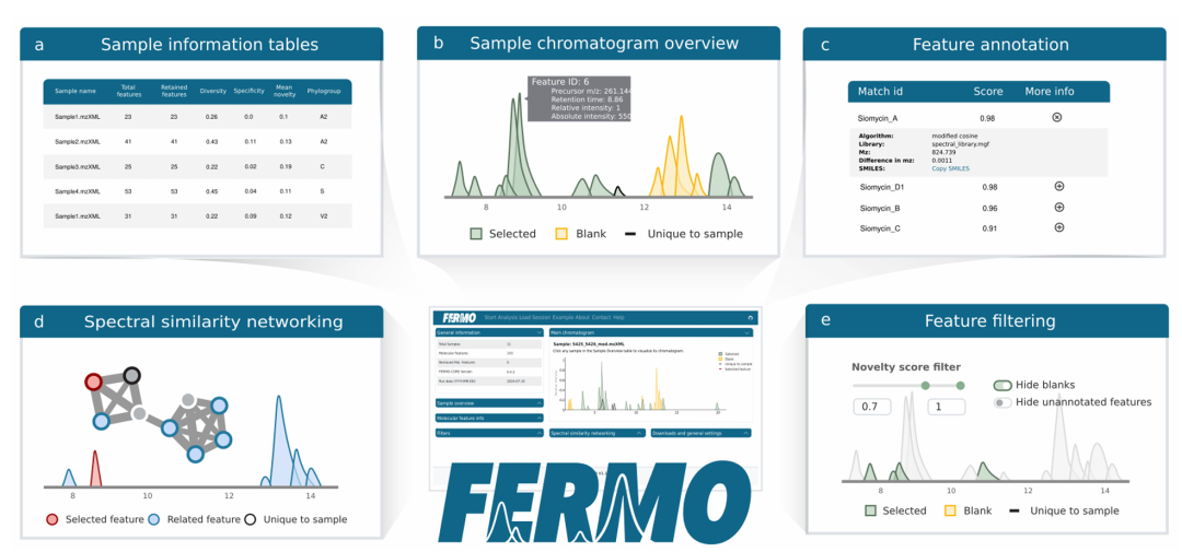 简介: 本文介绍FERMO,一个基于质谱数据自动优先化分子特征的免费在线仪表盘工具,其模块化框架支持代谢组学数据与表型、基因组和样本元数据的集成,通过交互式可视化和可重复的优先化流程,实现特征和样本的筛选。在两项基准研究中,FERMO成功重现了已知生物活性化合物的优先化结果,如在大戟属植物提取物中准确识别抗病毒活性特征,在链霉菌OSMAC研究中定位放线菌素及其类似物,且优先化的特征仅占数据集的0.7%。FERMO通过标准化输入输出和参数管理,提升了假设驱动的代谢组学分析效率,适用于天然产物研究、环境科学和微生物组学等领域,但目前仅支持特定格式的LC-MS/MS数据。