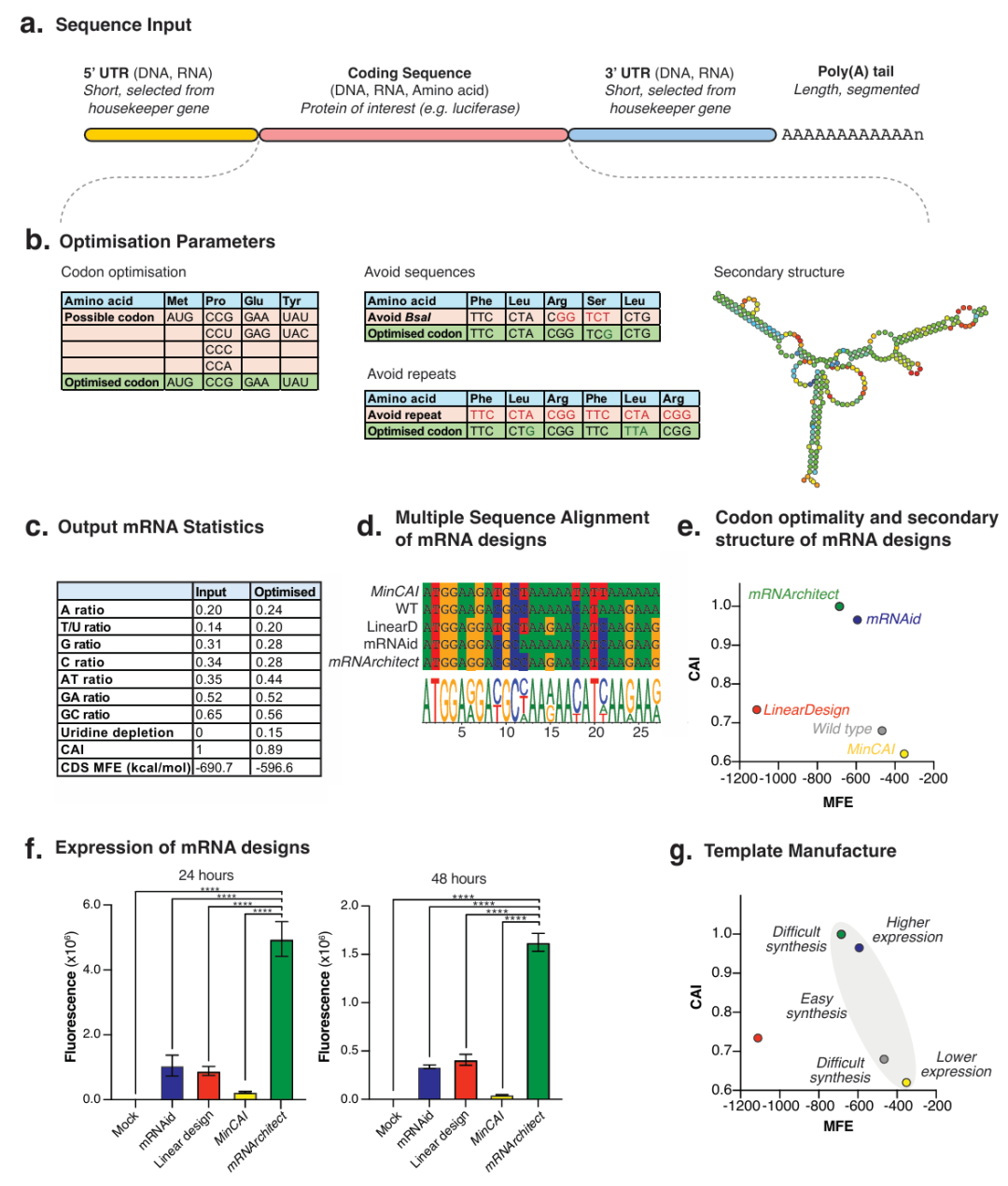简介: 本文开发了mRNArchitect软件工具包,用于辅助mRNA序列设计,可根据用户需求快速组装和优化mRNA序列,涵盖GC含量、二级结构、密码子优化和尿苷耗竭等参数,输出可直接合成且经实验验证的序列。在荧光素酶和eGFP的mRNA设计中,mRNArchitect生成的高密码子适应指数(CAI)序列在HEK293细胞中表达水平显著高于其他工具设计的序列,如最高CAI设计的荧光素酶mRNA表达量是最低CAI设计的21倍(24小时)。研究表明,mRNArchitect通过平衡序列优化参数和可制造性,为不同应用场景提供了灵活的mRNA设计方案,有助于推动mRNA疫苗和疗法的开发。