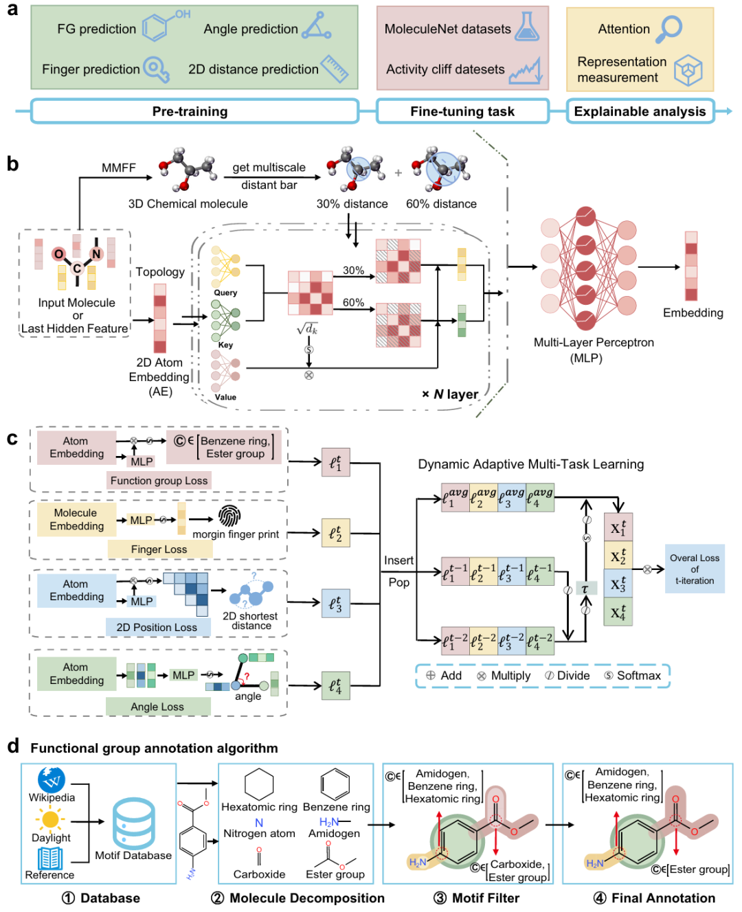 简介: 本文提出自构象感知图Transformer框架SCAGE,通过多任务预训练(分子指纹预测、官能团预测、2D原子距离预测和3D键角预测)和数据驱动的多尺度构象学习策略,提升分子性质预测的泛化能力和子结构可解释性。模型在9个分子性质和30个活性悬崖基准上表现优异,使用约500万类药物化合物数据集 pretrain,在PDBBind等数据集上的AUC-ROC和RMSE等指标优于GROVER、Uni-Mol等现有方法。消融实验验证了多尺度构象学习模块和官能团注释算法的有效性,案例研究显示其能准确捕捉与分子活性相关的官能团,为定量构效关系分析提供了新工具。
