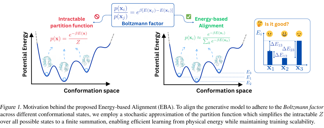 简介: 该论文提出Energy-based Alignment (EBA)框架,将生成模型与物理模型的反馈对齐,解决传统数据驱动方法难以整合物理约束的问题,通过平衡构象态的能量差异提升蛋白质构象集合生成的物理合理性。方法上,EBA通过可扩展的学习目标整合细粒度力场反馈,对预训练的全原子去噪扩散模型进行微调,使其生成符合玻尔兹曼分布的构象集合。实验在ATLAS MD数据集上进行,对比AlphaFold3、MDGen等基线模型,EBA在预测灵活性、分布准确性等指标上表现更优,例如在Pairwise RMSD和Global RMSF指标上分别达到0.62和0.71的相关系数,证明其生成的构象集合更贴近真实物理状态。该研究为生成模型与传统模拟方法的结合提供了新路径,有望推动结构生物学和药物发现领域的发展。
