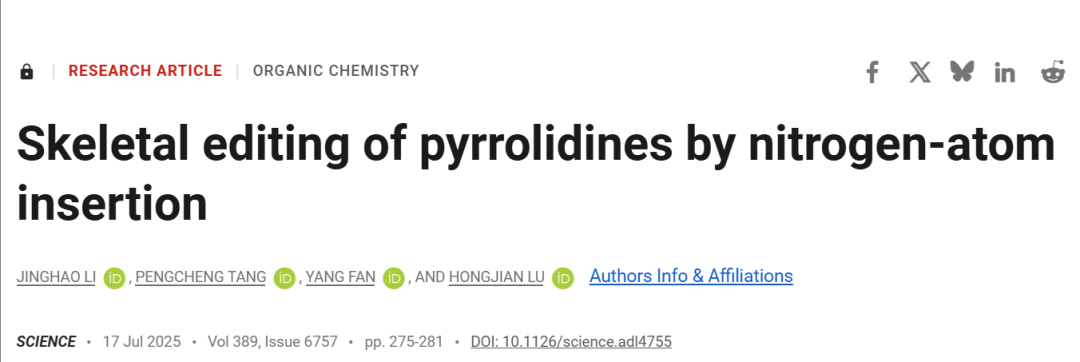 南京大学化学化工学院陆红健团队近期在《Science》发表的题为“Skeletal editing of pyrrolidines by nitrogen-atom insertion”的研究,为饱和含氮杂环的精准修饰提供了全新范式。这项工作不仅解决了长期困扰领域的技术瓶颈,更为药物分子的骨架多样化与后期优化开辟了高效路径。