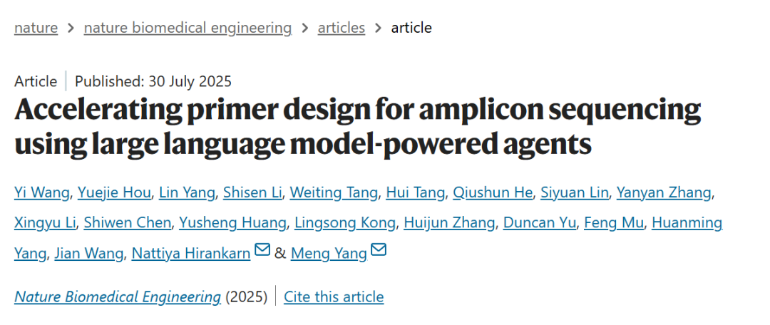 期刊: Nature Biomedical Engineering 链接: https://doi.org/10.1038/s41551-025-01455-z 代码: https://github.com/melobio/PrimeGen 简介: 本文介绍了 PrimeGen,一个由大语言模型驱动的多智能体系统,其创新点在于通过协同智能体简化靶向二代测序中劳动密集型的引物设计任务。该系统以 GPT-4o 为中央控制器,协调搜索、引物、协议和实验等专业智能体执行相应子任务,包括检索基因靶标、设计引物序列、生成机器人脚本及检测异常。实验中,PrimeGen 在 SARS-CoV-2 基因组测序、遗传性疾病基因筛查、结核分枝杆菌耐药突变检测和蛋白质突变体分析等场景中表现有效,可容纳多达 955 个扩增子,保证高扩增均匀性并减少二聚体形成。该论文表明,由通用基础模型协调的协作智能体有望成为推动生物医药研究的智能工具。