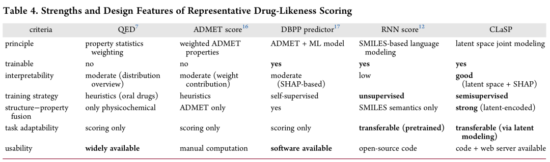 • 经验规则类方法 (如Lipinski的“五规则”、Veber规则等):基于经验观察,存在僵化性,定量区分能力有限,难以精准评估候选化合物的类药性差异。 • 定量评分方法 (如QED):虽能定量评估,但仅基于8项理化性质,缺乏对毒性等关键ADMET(吸收、分布、代谢、排泄、毒性)特征的考量。 • 机器学习分类模型 (如DBPP-Predictor):多采用二元分类法,受限于训练数据集的代表性,易出现过拟合,对新型化学实体的预测可靠性不足。 • 无监督学习方法 (如基于RNNs、VAEs的方法):通过潜在相似性间接评估类药性,可解释性差,难以用于结构差异较大的分子优化。 这些局限凸显了开发综合、可解释且稳健的类药性评分方法的迫切需求。