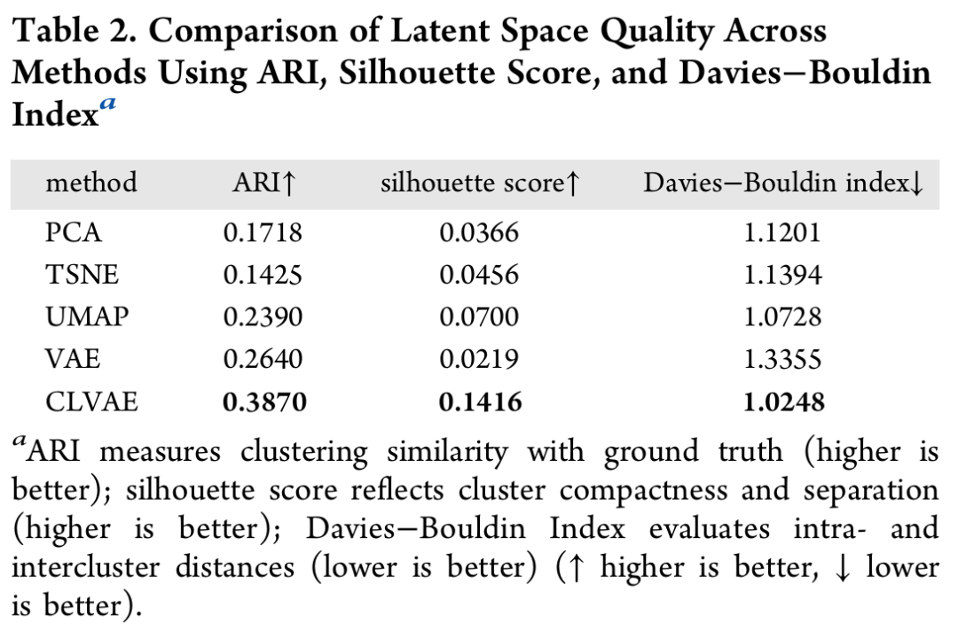 性能评估与优势分析 1. 潜在空间质量评估 与PCA、t-SNE、UMAP等降维方法相比,CLVAE生成的潜在空间在三个关键指标上表现最优:
