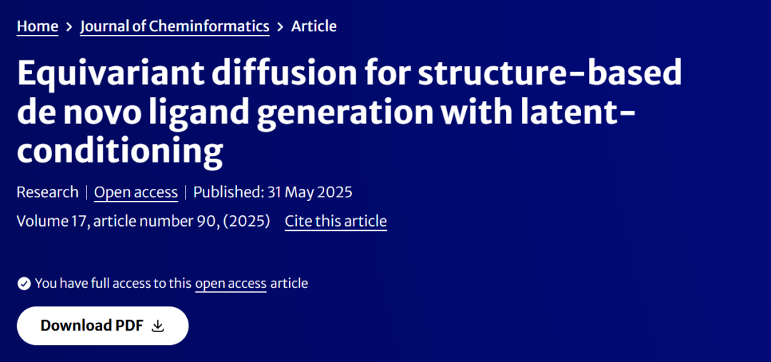 参考文献:Le, T., Cremer, J., Clevert, DA. et al. Equivariant diffusion for structure-based de novo ligand generation with latent-conditioning. J Cheminform 17, 90 (2025). https://doi.org/10.1186/s13321-025-01028-x