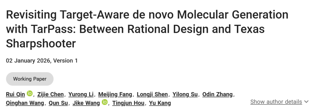 参考文献:Qin R, Chen Z, Li Y, Fang M, Shen L, Su Y, et al. Revisiting Target-Aware de novo Molecular Generation with TarPass: Between Rational Design and Texas Sharpshooter. ChemRxiv. 2026; doi:10.26434/chemrxiv-2026-dhdqk This content is a preprint and has not been peer-reviewed.