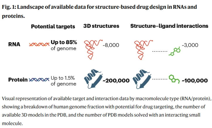 长期以来,绝大多数上市药物都以蛋白质为靶点。这一局面部分源于早期对蛋白质关键作用的发现。然而,近几十年的研究揭示了RNA转录本在体内具有意想不到的多样性和重要功能。据估算,人类基因组中高达85%的区域编码RNA,而蛋白质仅占极小部分。由此可见,RNA构成了一个巨大的、尚未充分开发的药物靶点宝库,也为开发全新类别的药物提供了独特机会(见图1)。