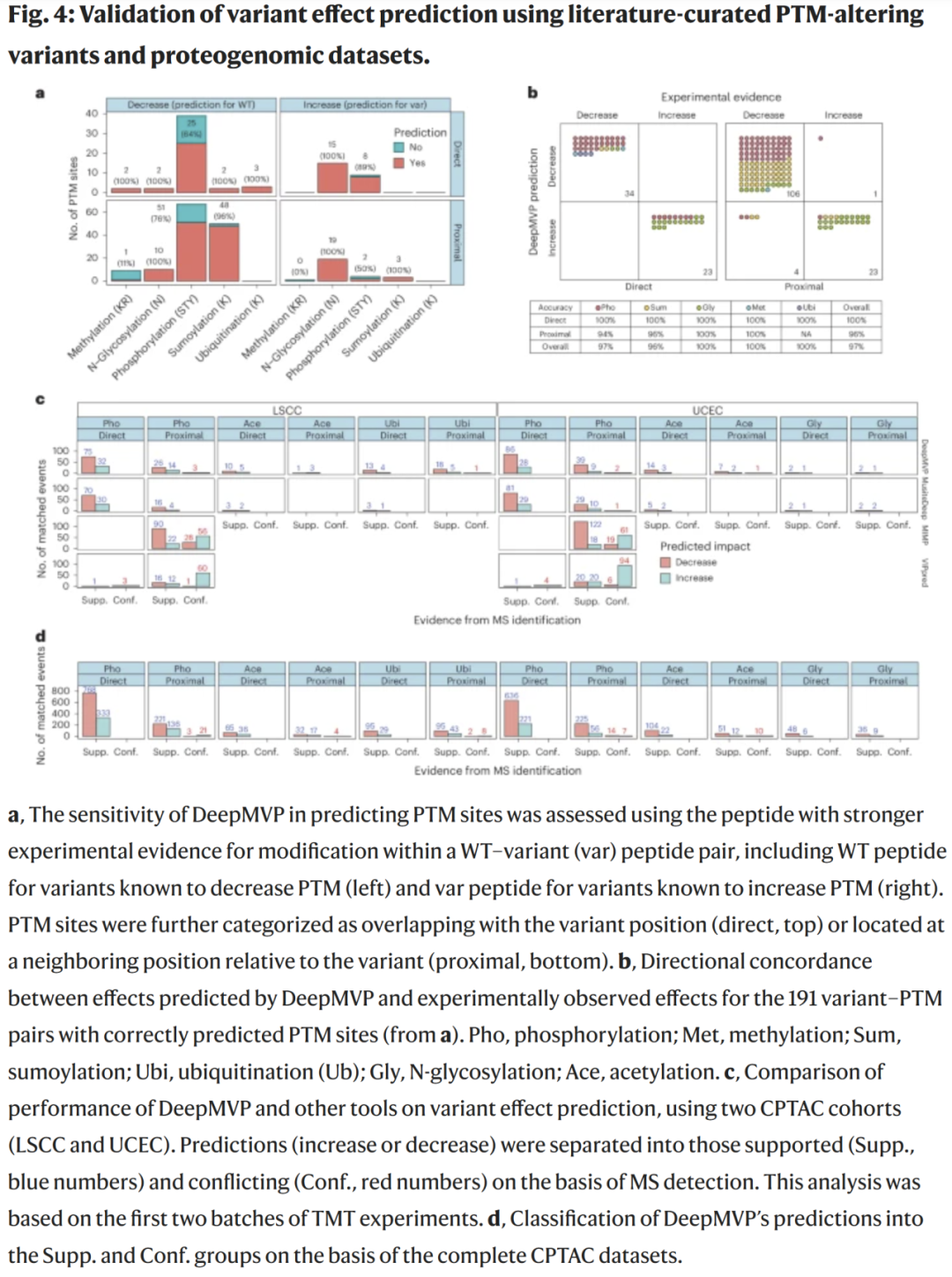 研究人员手工整理了235个文献验证的变异–PTM对,并在此基础上评估了DeepMVP的预测性能。结果显示,DeepMVP在81%的事件中正确识别了PTM位点,并在方向性预测上总体准确率达到97%。此外,在CPTAC癌症蛋白质组学数据集的验证中,DeepMVP在检测变异引起的PTM改变方面优于现有工具,且与实验结果高度一致。