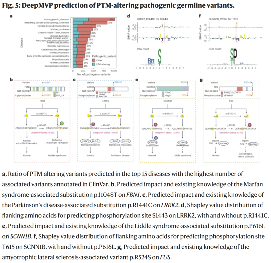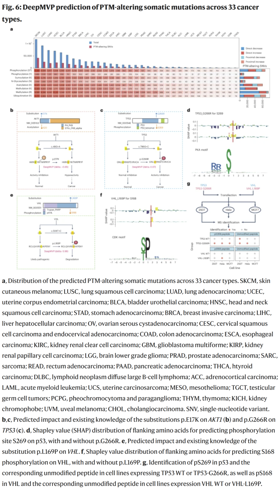 错义变异通过改变PTM进而影响蛋白质功能,是疾病发生的重要途径。现有预测方法受限于单一修饰类型和数据不足,无法实现全面评估。DeepMVP结合高质量的PTMAtlas数据库和先进的深度学习设计,实现了跨六类修饰的高精度预测,不仅在蛋白质组范围内扩展了PTM位点覆盖,也可靠地识别了变异导致的修饰改变。研究人员展示的案例(如ClinVar致病变异和癌症突变)表明,DeepMVP能够连接基因变异与功能后果,为揭示疾病机制和开发潜在治疗靶点提供新的工具。未来,随着更多实验数据的积累,DeepMVP有望进一步提升性能,并推广至更广泛的蛋白质修饰研究与临床应用。