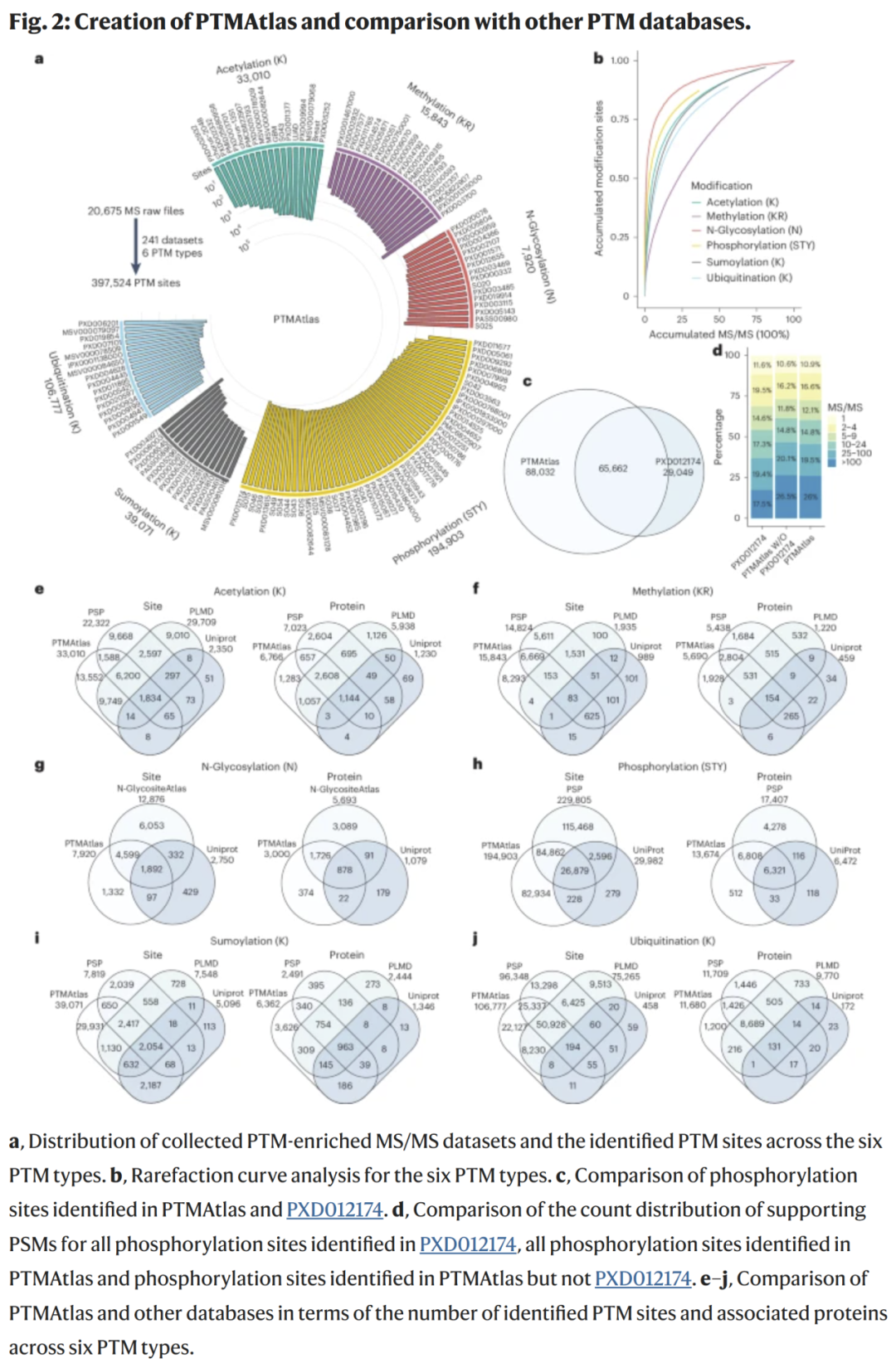 研究人员共鉴定出397,524个高置信度PTM位点,包括乙酰化(33,010)、甲基化(15,843)、N-糖基化(7,920)、磷酸化(194,903)、SUMO化(39,071)和泛素化(106,777)。与现有数据库(如PSP、UniProt等)相比,PTMAtlas在覆盖度和质量上均有显著提升。